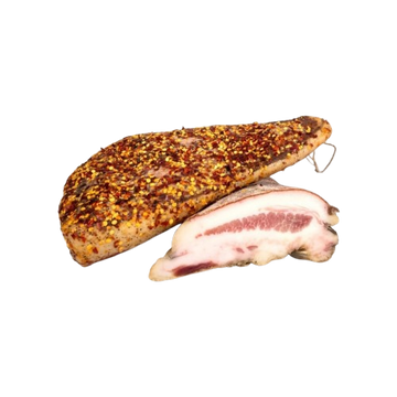 Il Guanciale Speziato Piccante è un salume tipico della Calabria, realizzato con guancia di maiale stagionata e aromatizzata con una miscela di spezie locali, che lo rende particolarmente saporito e piccante. La preparazione di questo salume segue antiche tradizioni artigianali, garantendone l'eccellenza e la qualità.